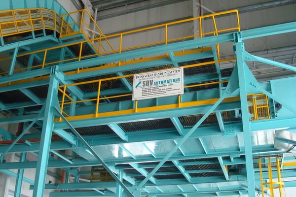 We take up turn key projects where sheet metal scrap genration is high in automotive body parts & other sheet metal components manufacturing companies. Our scope of supply includes design of clients, manufacture and installation of scrap handling systems. The system includes heavy and medium duty hinged steel belt conveyors of 2.5 inch, 4 inch 5 inch & 8 inch pitch chaiins, scrap collecting chutes, weighing hoppers & bailing machine. The entire system is controlled by plc based control panel with necessary safety measures.